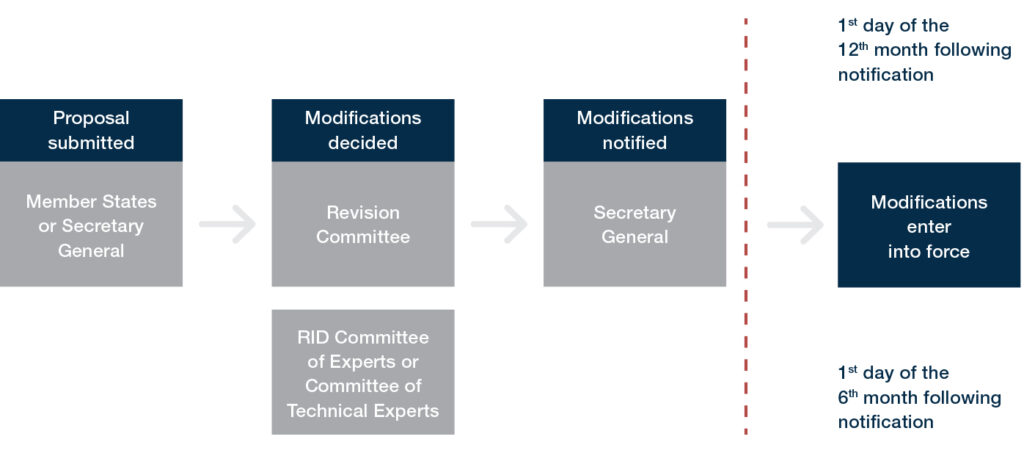 In addition, the RID Committee of Experts has the competence to modify the Regulation concerning the International Carriage of Dangerous Goods by Rail (RID).